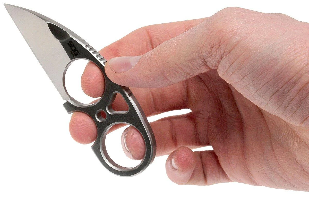 Le SOG Snarl JB01K-CP est un couteau de cou conçu par Jason Brous. Ce designer a déjà 10 ans d’expérience comme opérateur CNC et s’y connait en production de couteaux. Il utilise son savoir-faire et ses connaissances pour créer les designs de ses couteaux. Ses modèles se reconnaissent à leurs formes fonctionnelles, au style fantaisiste. La particularité de ce couteau de cou, c’est son format très compact. On peut le tenir de différentes manières : en utilisant les trous pour les doigts, les empreintes pour les doigts ou les deux. Avec en plus un jimping au dos de la lame, la prise en main est toujours bien ferme. La lame est faite en acier inoxydable 9Cr18MoV : un acier facile à aiguiser et qui conserve bien son tranchant. L’étui en nylon inclus permet de le transporter facilement et en toute sécurité. Cet étui est doté d’un clip de poche, pour accrocher le couteau discrètement à votre pantalon ou votre ceinture. Un cordon est également inclus pour l’attacher autour du cou : moins discret, mais il est fait pour !